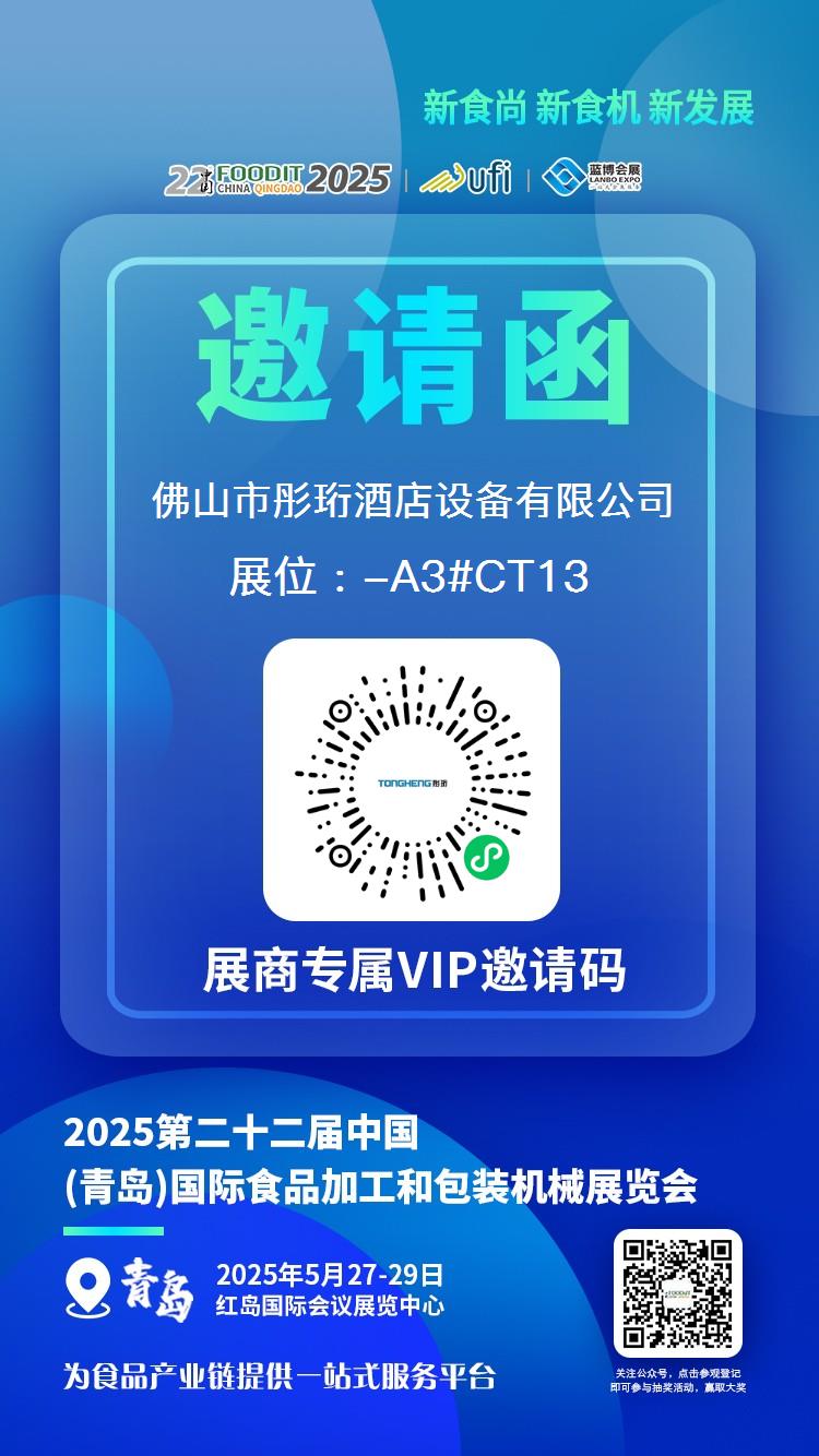 2025年5月27日至29日,佛山市彤珩酒店設備有限公司將攜食品生產蒸線、智能蒸包柜、除霧保溫柜、隧道式大蒸柜四大產品,亮相第二十二屆中國(青島)國際食品加工和包裝機械展覽會(展位號:紅島國際會議展覽中心A3館CT13)。我們誠邀您親臨現場,共同探索高效、智能的蒸制設備革新方案,賦能餐飲工業化升級。